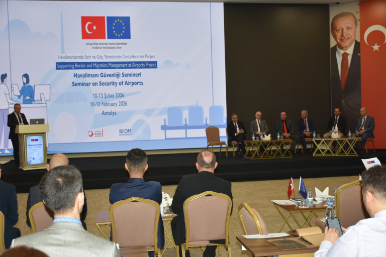 Havalimanlarında Sınır ve Göç Yönetiminin Desteklenmesi Projesi kapsamında Antalya’da 10-13 Şubat 2026 tarihleri arasında Havalimanı Güvenliği Semineri düzenlendi. İçişleri Bakanlığı Göç İdaresi Başkanlığı Sınır Yönetimi Genel Müdürlüğü tarafından gerçekleştirilen seminer, kamu kurumları, uluslararası kuruluş temsilcileri ve sivil havacılık sektörü paydaşlarını bir araya getirdi.